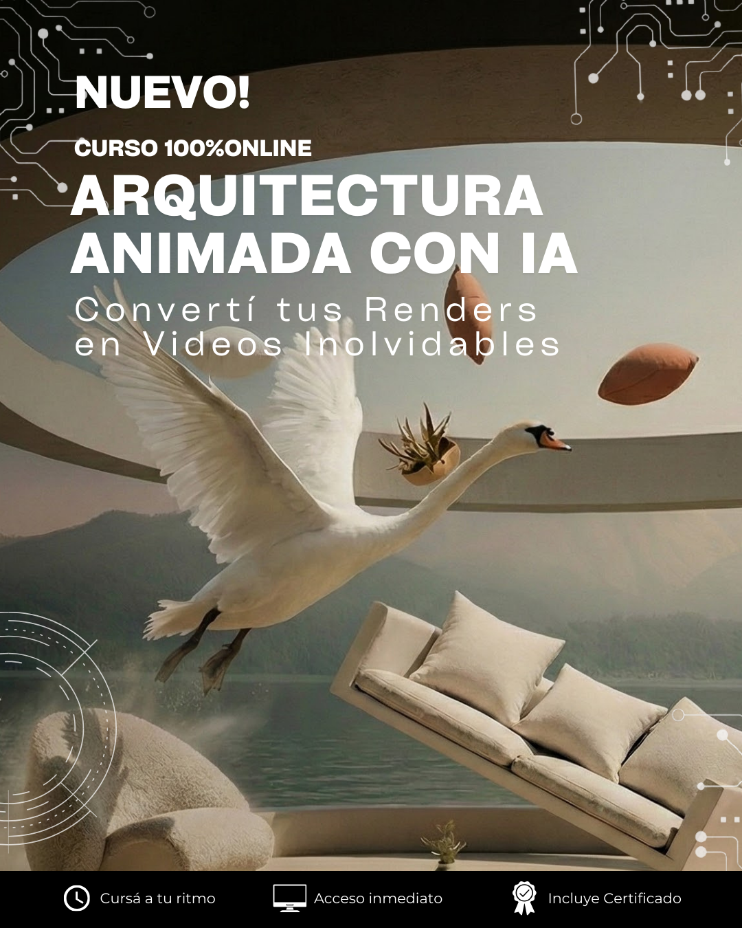 Descubrí cómo crear renders profesionales desde cero y luego transformarlos en videos impactantes con IA. Incluye los cursos “IA para Arquitectura y Deco” y “Arquitectura Animada con IA”.